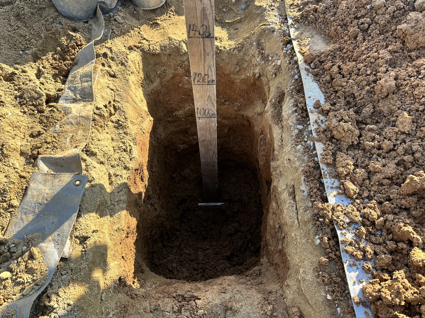 お墓の撤去後、遺骨の取り出し作業を開始しましたが、想像以上に粘土質の強い土壌で、スコップがなかなか入らず苦労しました。それでも丁寧に掘り進め、約140cmの深さまで達したところで、ご先祖様のお骨を順に確認。結果として、5体分のお骨を取り出すことができました。